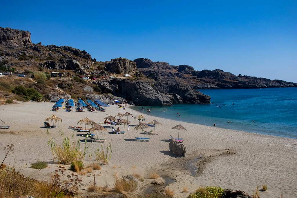 Damnoni Beach is one of the most beautiful beaches on the island of Crete. Nestled against mountains and enclosed by stunning rocky formations, it features white sand and turquoise waters. The location of Damnoni Beach includes several smaller nearby beaches that are equally amazing. Another advantage of visiting Damnoni is that it has a relatively modest crowd for most of the year. It offers numerous tourist services and activities. Furthermore, Damnoni Beach is undoubtedly a wonderful area of Crete to spend your entire vacation.